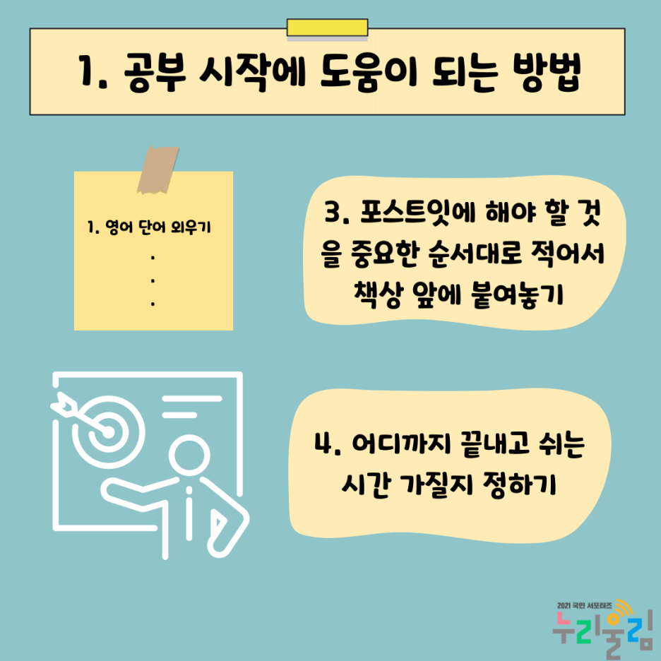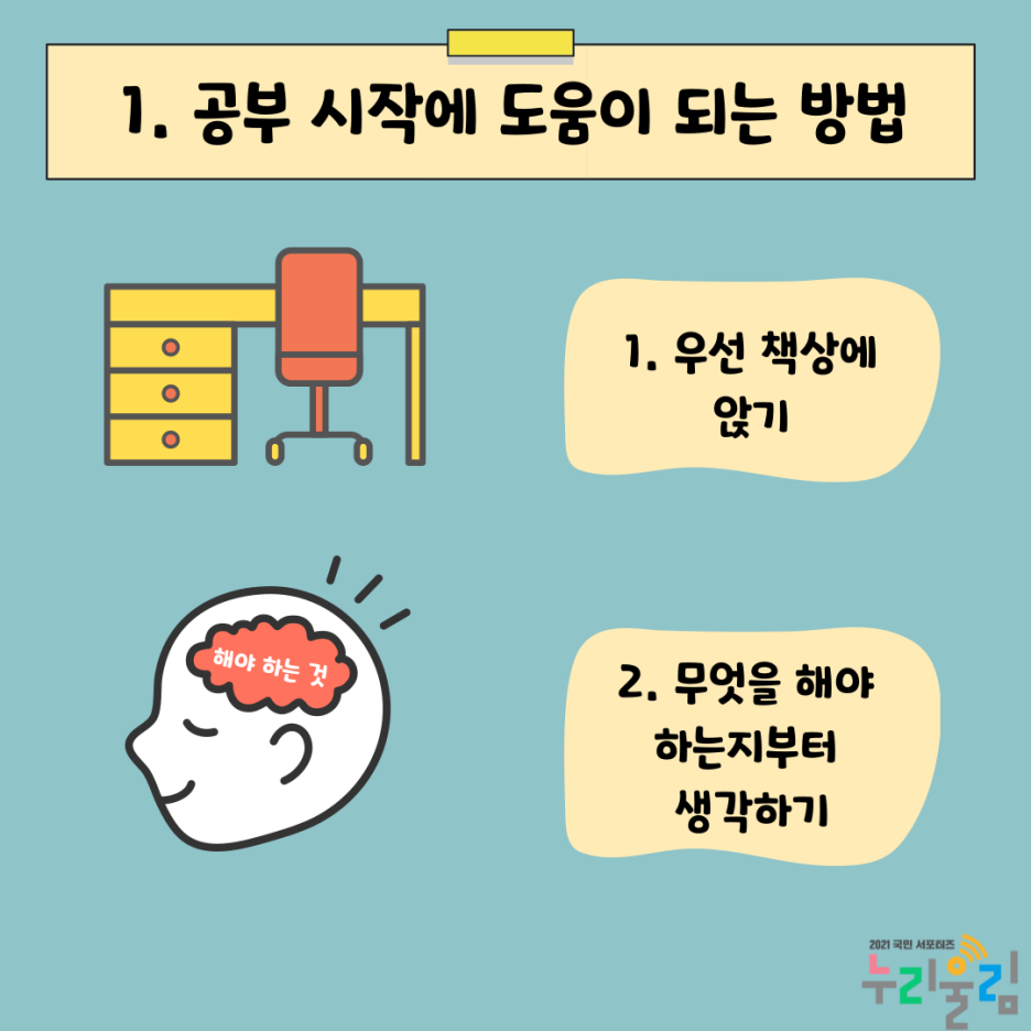 벌써 올해의 반이 지나가고 있습니다. 이 말은 곧 기말고사를 보고 방학을 한다는 얘기이기도 하죠! 기말고사나 혹은 다가오는 방학 중에 각자 도전할 자격증 시험 등을 앞두고 다들 공부해야겠다고 마음은 먹지만 막상 책상 앞에 앉으면 다른 생각들이 머릿속을 헤집어 놓아서 시작하기가 어렵죠? 그래서 오늘은 공부를 시작하고자 하는 학생들에게 공부할 때 도움이 되는 방법을 알려드리려고 합니다.
