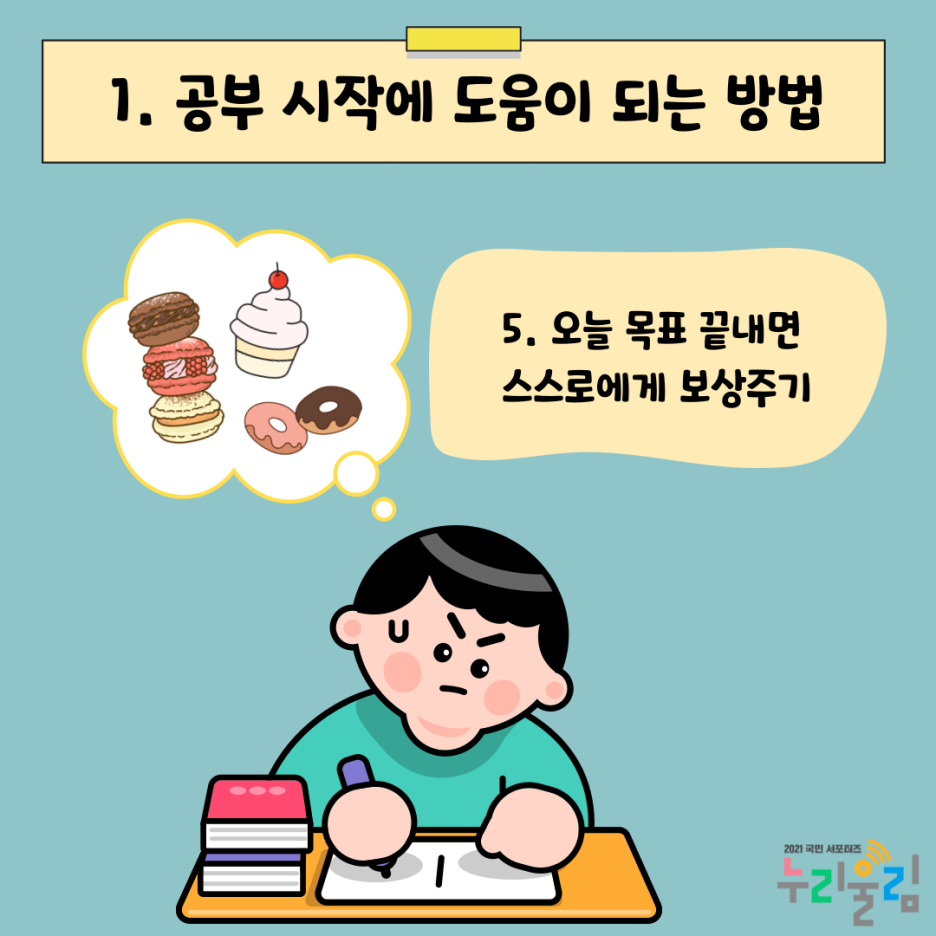 사실, 공부를 시작하려고 책상에 앉기까지가 오래 걸리는 거 같아요. 공부를 시작하려고 하면 막 지저분한 책상이 보여서 정리를 하고 싶어지고, 꼭 애매한 시간이면 정각을 맞추고 싶어지는 그런 마음이 들고는 하죠? ‘시작이 반이다’라는 말이 있듯이, 정말 책상에 앉아서 공부할 것들을 올려놓는 게 중요한 것 같아요. ‘공부해야겠다!’ 마음을 먹었다면 그 마음을 가지고 바로 실행에 옮기는 게 중요한데요. 사실 ‘공부해야 하는데’, ‘딱 시계가 정각이 되면 일어나서 해야겠다’ 이런 식으로 생각하게 되면 공부 시작 자체가 늦어지게 되기 때문에 공부해야겠다는 생각이 들면 일단 미루지 말고 책상에 앉는 연습부터 한 번 해보세요!