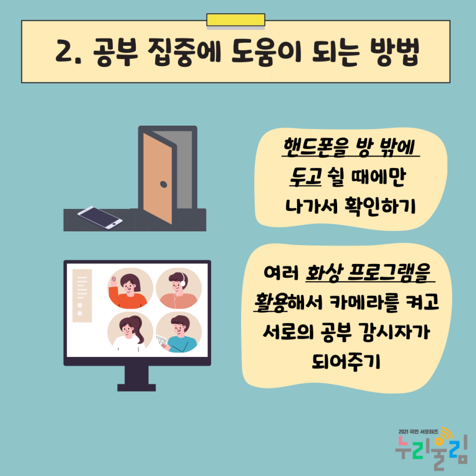 이외에도 자신이 집중을 얼마나 하는지 확인하기에 제일 좋은 방법으로 스톱워치를 활용하여 ‘순수 공부 시간’을 재는 방법, 핸드폰을 활용해서 공부하는 모습을 담는 ‘타임랩스’를 찍는 방법, 그리고 ZOOM이나 Google Meet 등 여러 화상 프로그램을 활용해서 카메라를 켜서 친구와 함께 서로의 공부 감시자가 되어주는 방법 등이 있습니다.