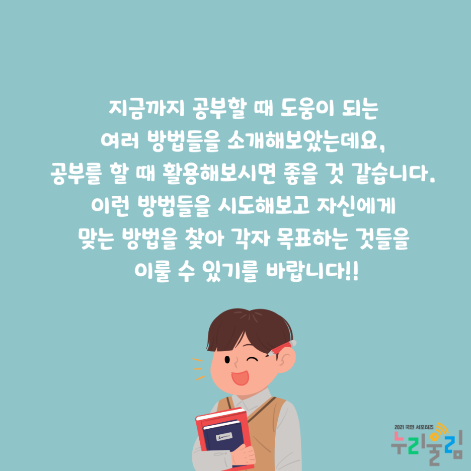 지금까지 공부할 때 도움이 되는 여러 방법들을 소개해보았는데요, 다들 각자 공부할 때 활용해보시면 좋을 것 같습니다. 이런 방법들을 시도해보고 자신에게 맞는 방법을 찾아보면서 목표하는 것들을 이룰 수 있기를 바랍니다!