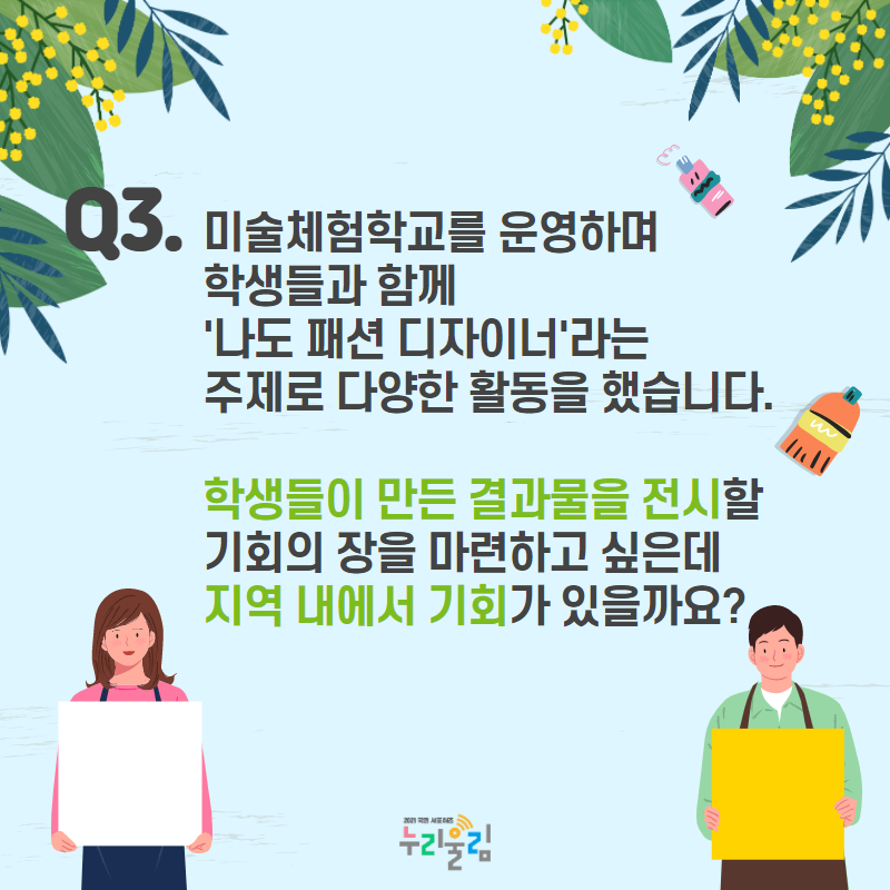 Q3. 미술체험학교를 운영하며 학생들과 함께 ‘나도 패션 디자이너’라는 주제로 다양한 활동을 했습니다. 학생들이 만든 결과물을 전시할 기회의 장을 마련하고 싶은데 지역 내에서 기회가 있을까요?