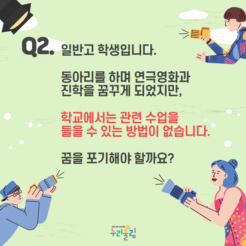 Q2. 안녕하세요, 일반고에 재학 중인 학생입니다. 동아리를 하며 연극영화과 진학을 꿈꾸게 되었지만, 학교에서는 관련 수업을 들을 방법이 없습니다. 꿈을 포기해야 할까요?