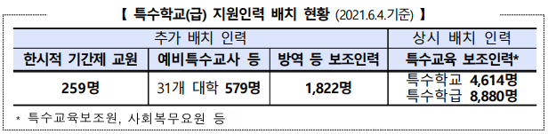 그간 교육부와 시도교육청은 안전한 등교수업 여건을 조성하기 위해 특수교육 종사자(교직원, 보조인력 등)에게 백신접종을 우선 추진하였고, 지원인력 확대 배치, 기숙사 및 학교버스 밀집도 조정 등 관련 지원을 강화해 오고 있다.