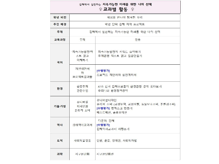 김해 봉명중학교에서는 2020년 1학기, “김해, 지속 가능한 미래 프로젝트”를 진행했습니다. 우리가 사는 이곳에서, 스스로 실천할 수 있는 지속 가능한 미래 활동은 무엇이 있을지 찾고 실천하는 프로젝트였습니다. 로컬푸드 및 친환경 먹거리, 슬로시티, 양성평등, 친환경 교통수단, 멸종 위기 동물 조사, 패스트 패션 등 아이들 저마다의 개성처럼 다양한 탐구 주제가 나왔습니다. 등교가 어려운 상황 속에서도 사전에 배부된 활동지와 화상 수업으로 빈틈을 메꿔나가며 아이들은 저마다의 탐구 결과물을 만들어냈습니다.