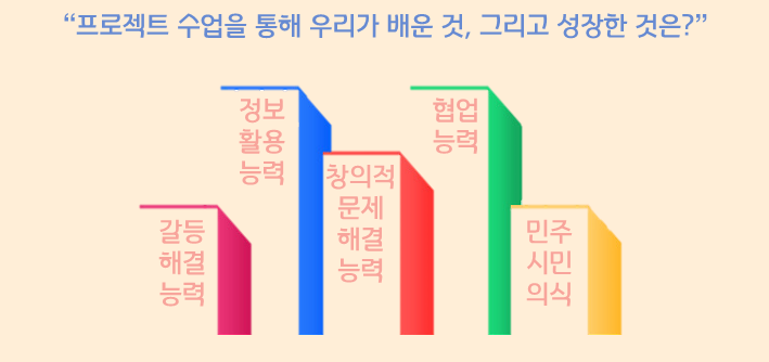 아이들은 한 학기 동안의 프로젝트 수업을 통해 어떤 것들이 성장했다고 느꼈을까요? 정보 활용, 협업, 발표, 갈등 해결 능력 등 다양한 답변이 나왔습니다. 저마다 프로젝트 중 힘들었던 부분들을 스스로 극복해나가며, 미래 사회를 살아가기 위한 역량 한 가지씩은 배워나간 것 같습니다.