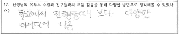 화상회의로 진행된 모둠 활동에서는 역할 분담과 협력이 필수적이었습니다. 서로 같은 공간에서 활동하는 것이 아니고, 시시각각 활동 진행 상황을 확인할 수 없어, 학생 개개인의 개별 책무성이 강조되다 보니, 무임승차도 사라지고, 협동하는 모습들이 더 늘어났습니다. 덕분에 선생님은 한 명씩 더욱 신경 써서 피드백을 할 수 있었습니다.