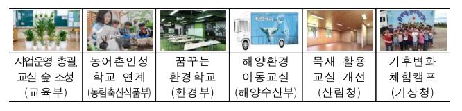 각 부처는 전문분야를 활용하여 학교생활 속에서 기후위기·생태전환 교육을 할 수 있도록 기후변화 교재, 꿈꾸는 환경학교(환경교실), 국산 목재를 활용한 교실 개선 등을 지원한다.