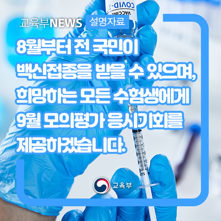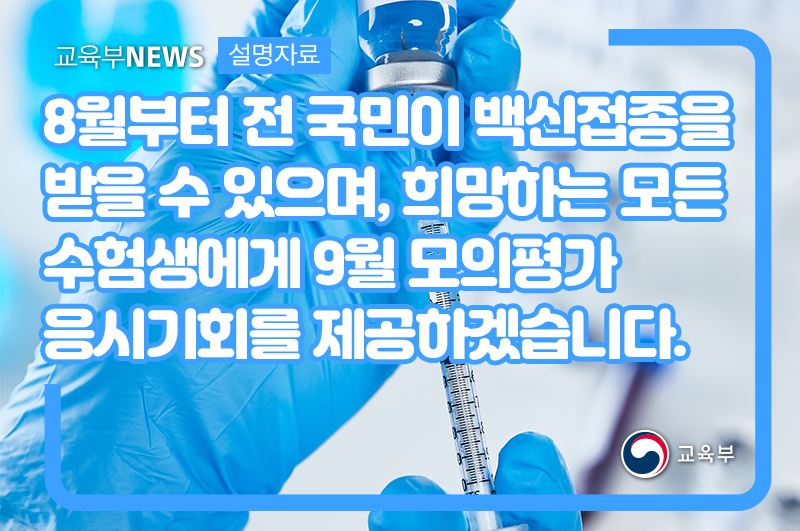 8월부터 전 국민이 백신접종을 받을 수 있으며, 희망하는 모든 수험생에게 9월 모의평가 응시기회를 제공하겠습니다.