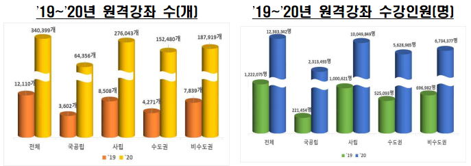 원격강좌 수강인원도 2020년 12,363,342명으로 전년(1,222,075명) 대비 911.7%로 대폭 증가했다.