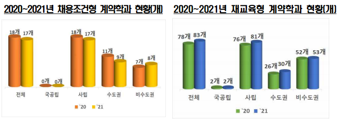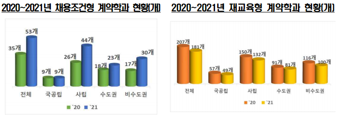 ‘재교육형’ 계약학과 수는 181개로 2020년(207개)보다 12.6% 감소했고, 학생 수는 5,322명으로 2020년(6,011명)보다 11.5% 감소했다.