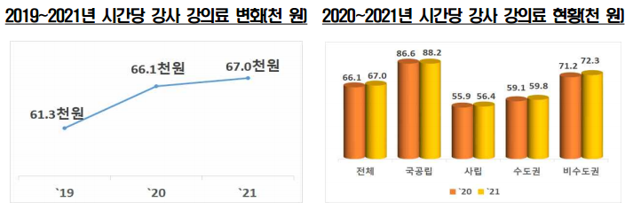 2021년 1학기 강사 강의료 평균은 시간당 67.0천 원으로 2020년(66.1천 원)보다 0.9천 원(1.3%) 상승했다.