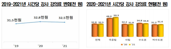 2021년 1학기 강사 강의료 평균은 시간당 32.5천 원으로 2020년(32.8천 원)보다 0.3천 원(0.9%) 감소했다.