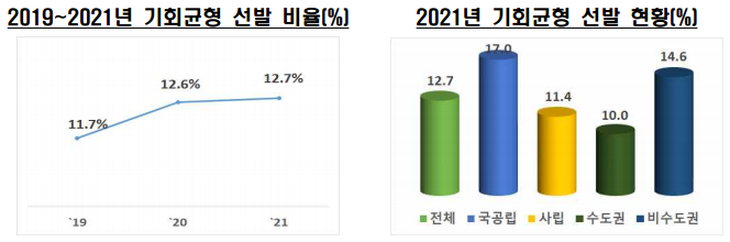 국공립대학의 기회균형선발 비율은 17.0%로 사립대학(11.4%)보다 5.6%p 높았고, 비수도권대학은 14.6%로 수도권대학(10.0%)보다 4.6%p 높았다.
