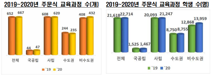 (주문식 교육과정 운영 현황) 2020년 주문식 교육과정* 수는 667개로 2019년(652개)보다 2.3% 증가하였고, 주문식 교육과정에 참여한 학생 수는 22,714명으로 2019년(21,618명)보다 5.1% 증가했다.