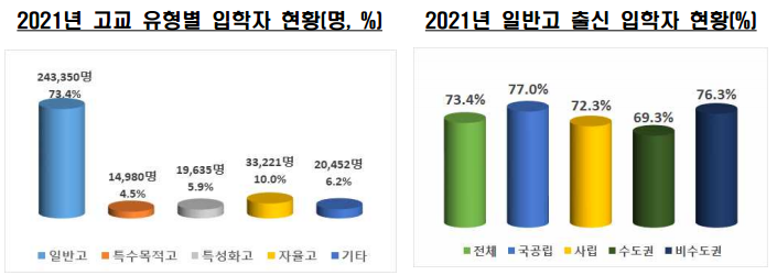 (신입생의 출신고 유형별 현황) 2021년 일반 및 교육대학 신입생의 출신고 유형별 비중은 일반고 73.4%(243,350명), 특수목적고 4.5%(14,980명), 특성화고 5.9%(19,635명), 자율고 10.0%(33,221명), 기타* 6.2%(20,452명)이다.