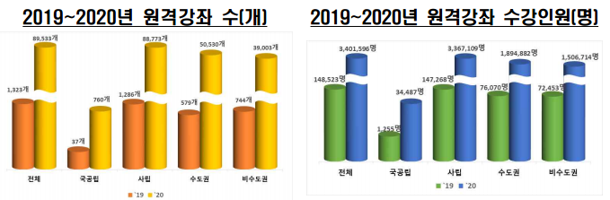 원격강좌 수강인원도 2020년 3,401,596명으로 전년(148,523명) 대비 2,190.3%로 대폭 증가했다.