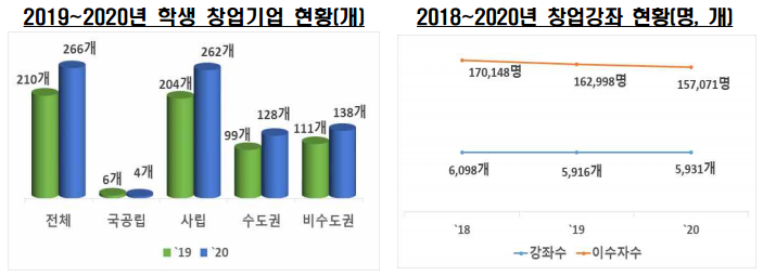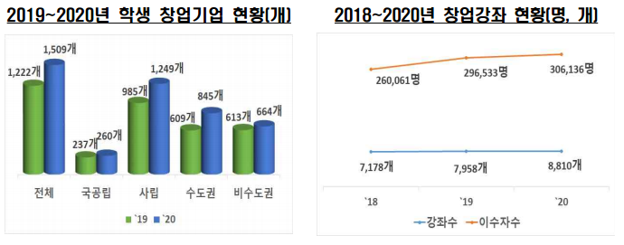 2020년 창업강좌 수는 8,810개로 2019년(7,958개)보다 10.7% 증가했고, 창업강좌 이수자 수는 306,136명으로 2019년(296,533명)보다 3.2% 증가했다.