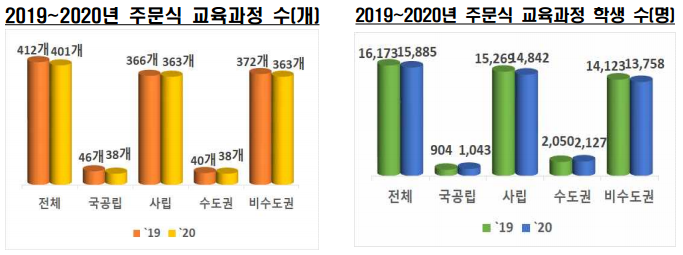 (주문식 교육과정 운영 현황) 2020년 주문식 교육과정* 수는 401개로 2019년(412개)보다 2.7% 감소하였고, 주문식 교육과정에 참여한 학생 수는 15,885명으로 2019년(16,173명)보다 1.8% 감소했다.