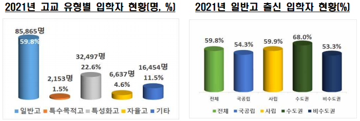 국공립대학의 일반고 출신 비율은 54.3%로 사립대학(59.9%)보다 5.6%p 낮았고, 수도권대학은 68.0%로 비수도권대학(53.3%)보다 14.7%p 높았다.