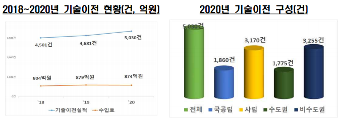 (기술이전 실적 및 이전 수입료) 2020년 기술이전 실적은 5,030건으로 2019년(4,681건)보다 7.5% 증가했고, 기술이전 수입료*는 874억 원으로 2019년(879억 원)보다 0.6% 감소했다.