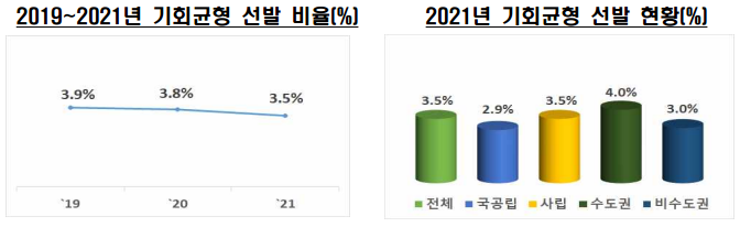 국공립대학의 기회균형선발 비율은 2.9%로 사립대학(3.5%)보다 0.6%p 낮았고, 수도권대학은 4.0%로 비수도권대학(3.0%)보다 1.0%p 높았다.