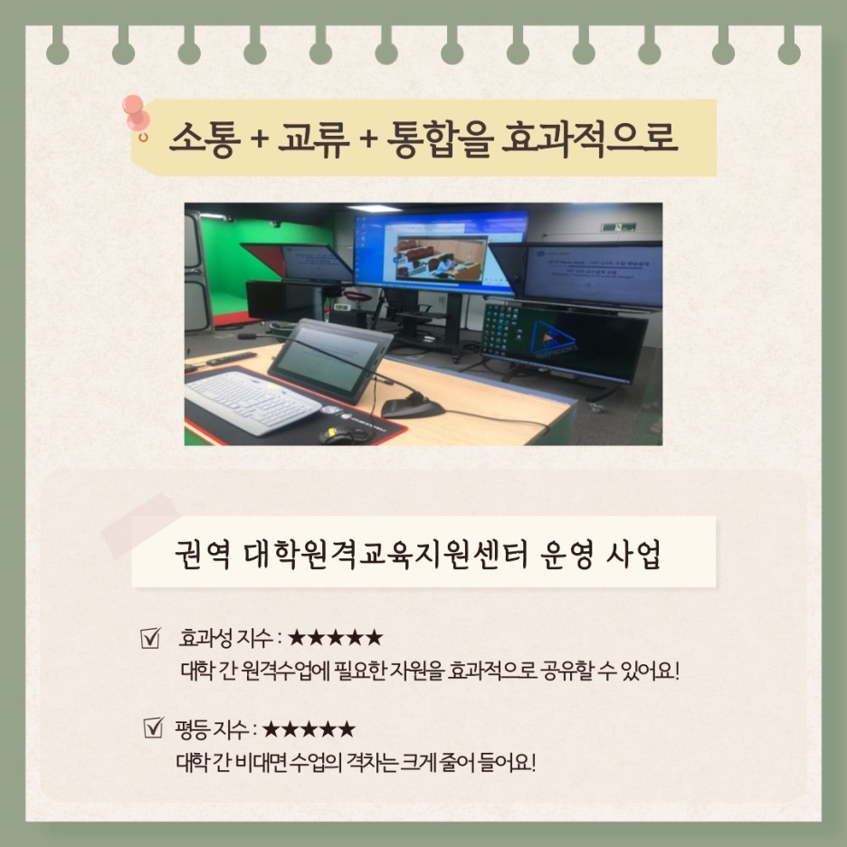 교육부는 교육 기관뿐 아니라 산학 기관과도 협력하여 교육 분야의 새로운 사업을 효율적이며 창의적으로 지원하고 있는데요. 먼저, 교육 기관 간의 협력 사업으로 대학원격교육지원센터 지정·운영 사업에 대해 소개하고자 합니다. “권역 대학원격교육지원센터 지정·운영 사업”이란, 코로나19로 원격수업이 더욱 필요해진 가운데 대학 간 비대면 수업의 품질 편차를 줄이고 비상시 수업을 받지 못하는 대학생들의 교육권을 안정적으로 보장하기 위해 도입되었습니다. 전국을 총 10개의 권역으로 나누어서 권역 원격교육지원센터를 설치하여, 해당 권역 내 일부 대하 간 공동 활용 강의, 학습관리시스템을 개발하고 원격교육 기술 향상을 크게 지원하고 있습니다.