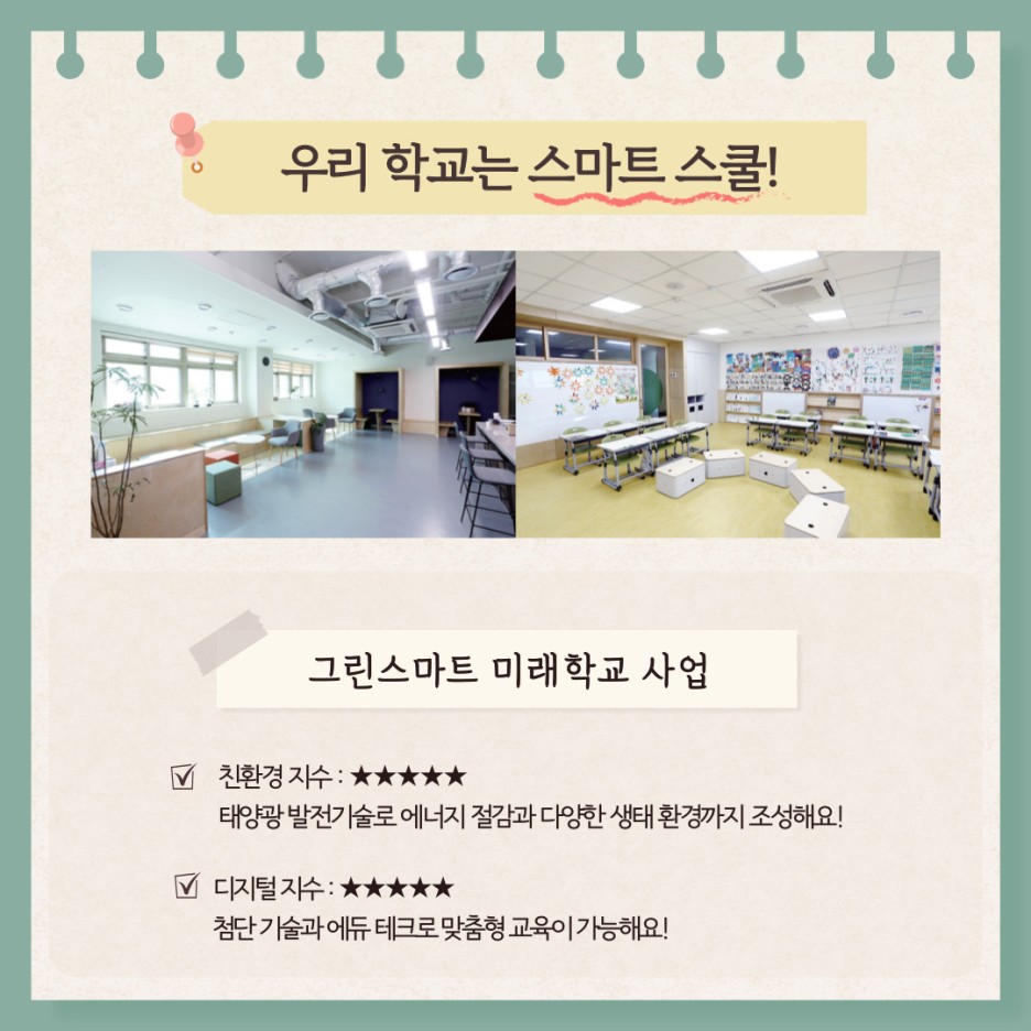 그린스마트 미래학교 사업은 학교 차원에서 친환경적이고 디지털에 기반한 교육환경을 조성하려는 사업입니다. 왜 그린 스마트 미래학교 사업을 하나고요? 낡고 오래된 교육환경이 아닌, 환경친화적이면서 첨단 디지털 교실에서 4차 산업혁명에 맞는 인재를 효과적으로 육성할 수 있기 때문입니다. 구체적으로 어떻게 하나고요? 먼저, 친환경적인 교육환경은 태양광 발전 기술 등을 이용하여 에너지를 절감하거나 텃밭 등 다양하면서도 건강한 공간을 만들어서 할 수 있답니다. 스마트한 교육은 학교 전체가 첨단 기술을 도입하고, 무선 인터넷 환경을 지원하는 동시에, 빅테이터 등 에듀테크를 이용하여 개인 맞춤형 학습을 지원하는 방식으로 만들 수 있습니다.
