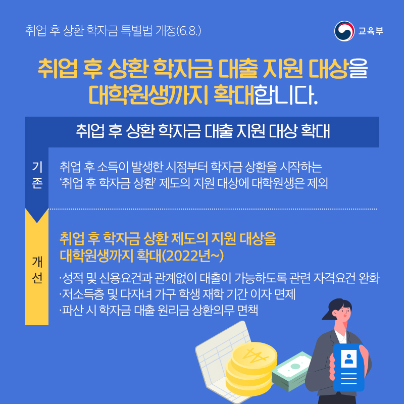취업 후 상환 학자금 대출 지원 대상을 대학원생까지 확대합니다.