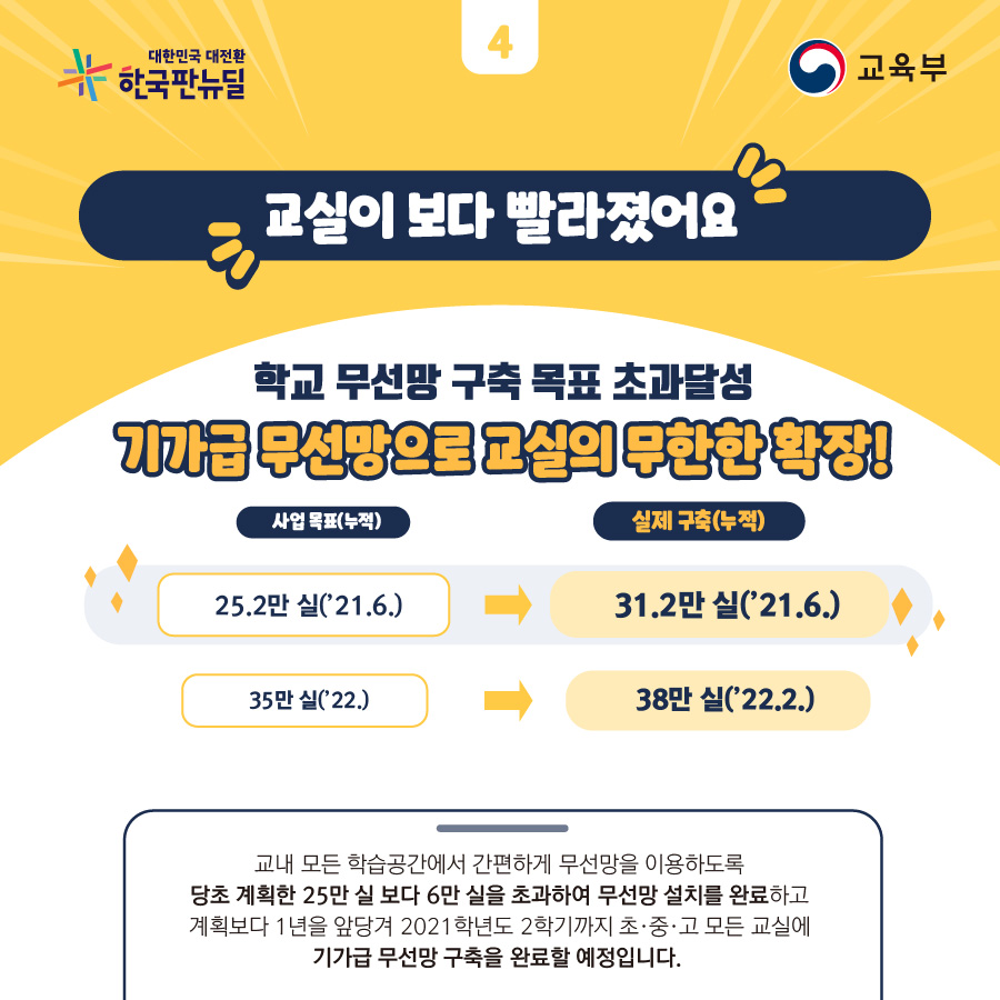 ✔ 계획보다 1년을 앞당겨 2021학년도 2학기까지 초·중·고 모든 교실에 기가급 무선망 구축을 완료할 예정입니다.