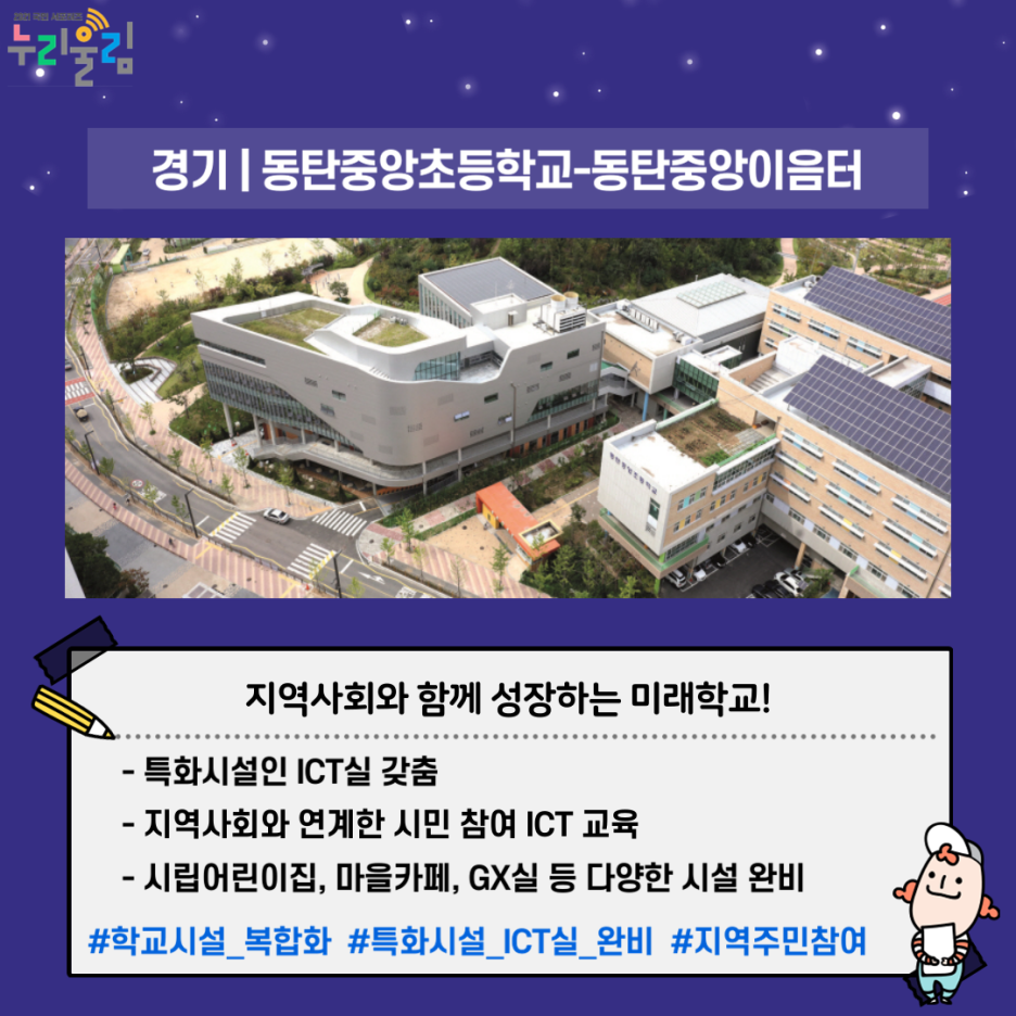 이런 시설은 학령인구 감소로 인해 학교의 유휴공간을 주민과 함께 이용할 수 있어 학교와 지역사회가 함께 발전할 수 있다는 장점이 있습니다. 또한, 일반 강의식 교육보다 지역사회와 함께 어우러지는 교육을 받을 수 있으니, 교육의 질은 더욱 올라가겠죠?