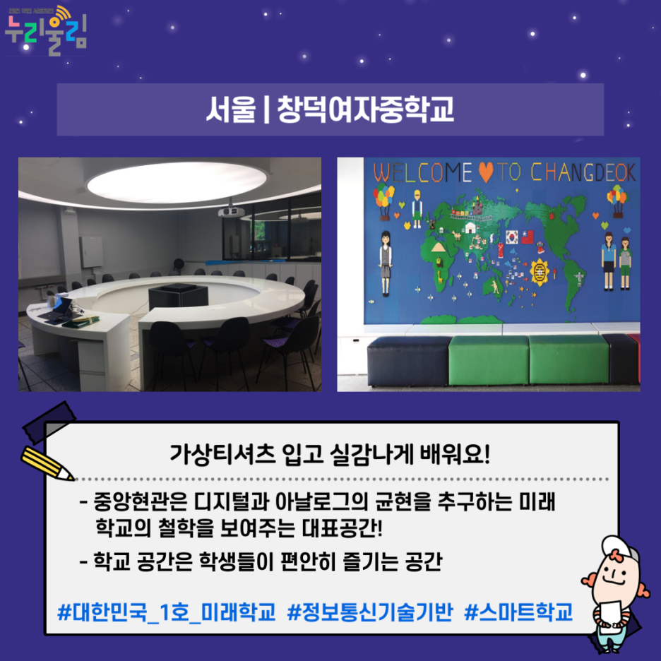 창덕여자중학교는 2015년부터 서울특별시교육청에서 미래학교 연구학교로 지정된 학교로 문재인 대통령께서도 방문한 학교인데요! 창덕여자중학교 1층 중앙현관은 디지털과 아날로그의 균형을 추구하는 미래학교의 철학을 보여주는 대표적인 공간입니다. 모든 공간은 학생 중심으로 배우는 공간, 표현하는 공간, 나누는 공간, 즐기는 공간으로 구분되어 있다고 합니다.