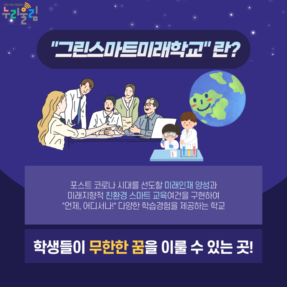 코로나19로 바뀐 사회는 기존의 학교와 교실, 교사의 역할과 학습 방법 등 교육 전반에 대한 근본적인 변화를 요구하고 있습니다. 이에 맞춰 4차 산업혁명에 걸맞은 인재를 키우려면 그에 맞는 기술과 디바이스, 콘텐츠가 적용된 맞춤형 교육으로 전환되어야 하고, 오래되고 낡은 학교 건물을 보수하는 것을 넘어 미래에 필요한 역량을 경험하고 깨우칠 수 있는 유연한 공간으로의 혁신이 필요합니다. 또한, 기후 변화, 환경오염, 인구 감소 등 세계적 위기에 대응할 수 있는 공동체 연대의 장, 민주시민교육 중심으로 학교가 기능하며, 학교와 지역사회가 하나 되어 아이들을 키우고, 시민도 맘껏 학교시설을 이용하며 배우고 즐길 수 있는 열린 학교! 그런 학교가 바로 “그린스마트 미래학교”입니다!