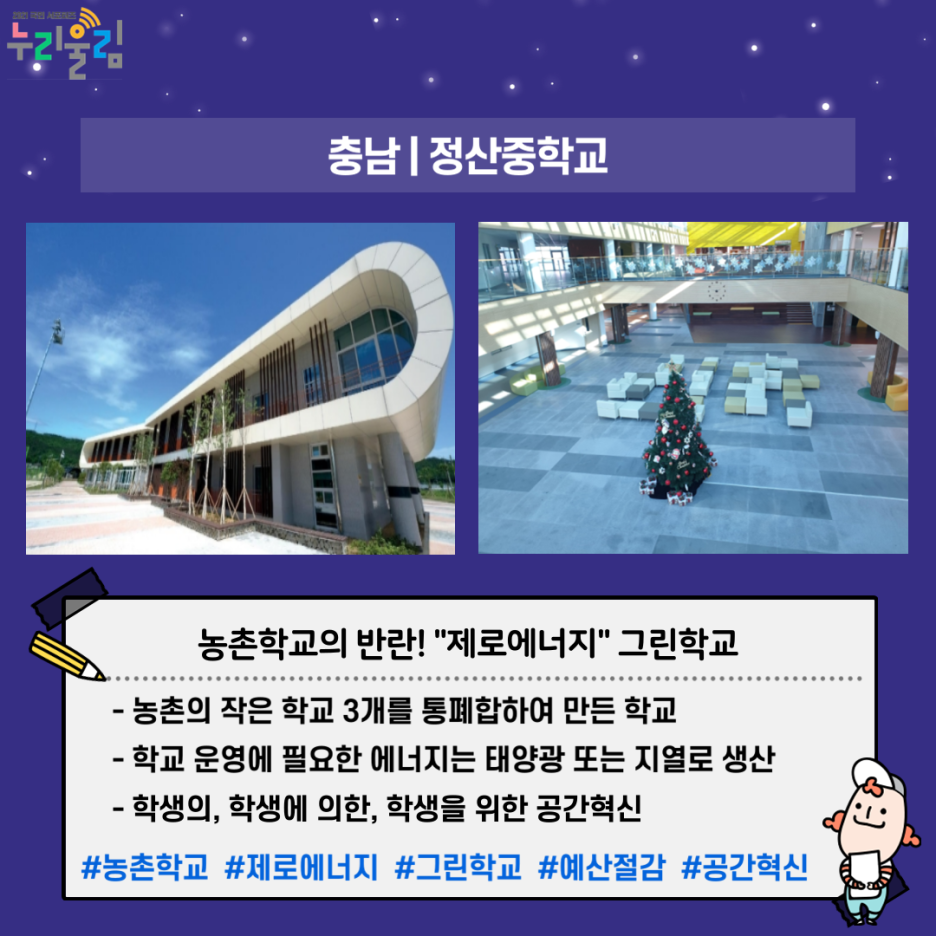 충남 청양군 정산면에 위치한 정산중학교는 2020년 3월 인근의 중학교 3개를 하나로 통폐합해 '제로 에너지' 학교로 새롭게 태어났습니다. 태양열과 지열을 활용한 제로 에너지 건물과 학생이 중심이 되는 공간 혁신으로 2020년 ‘대한민국 우수시설학교’ 대상을 수상하기도 했답니다! 학교 건물 지붕에 설치한 태양광 패널에서 생산되는 전기가 학교에서 필요한 에너지양을 감당할 수 있게 되면서 비용도 많이 절감했다고 합니다. 더불어 학생들이 생활하는 기숙사의 냉난방 시스템은 지열을 활용한다고 하는데요. 땅속 200m에서 23℃로 유지되는 지하수를 끌어올리면 금방 데우거나 차갑게 할 수 있어 덕분에 전력 소모가 적다고 합니다.