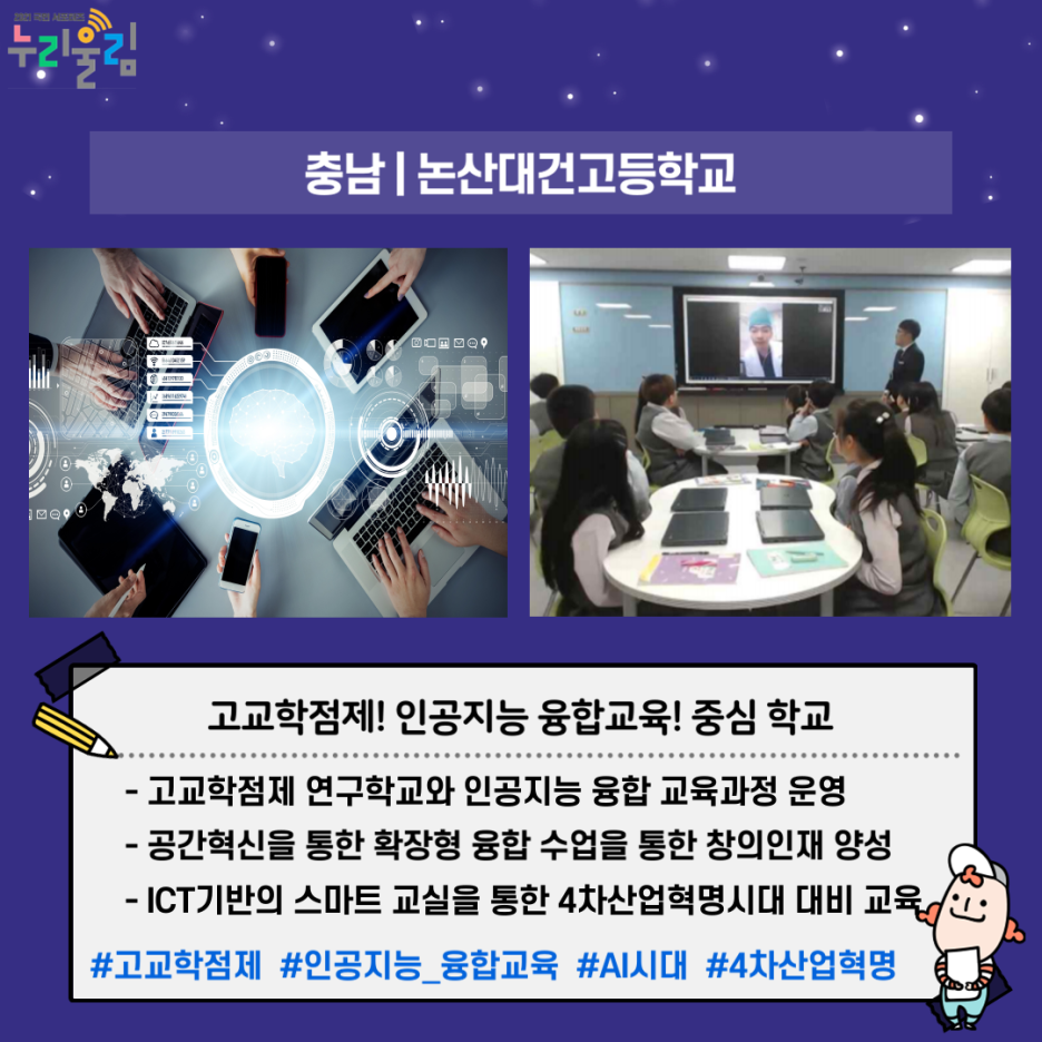 고교학점제 연구학교와 인공지능 융합 교육과정을 운영하고 있는 논산대건고등학교는 학생들의 과목 선택권을 보장하고 학생 맞춤형 교육을 실현하기 위해 4차 산업 혁명 시대에 발맞춰 학교의 변화를 꾀하고 있습니다. 이뿐만 아니라 인공지능 융합 교육을 위한 기반 조성에도 박차를 가했는데요. ‘AI 융합교육센터’는 2015 개정 교육과정에서 강조하는 창의·융합형 인재 양성의 요람으로 기술발전이 사회 변화를 주도하는 4차 산업 혁명 시대에 꼭 필요한 공간입니다. 현재 도서관으로 사용되고 있는 공간에 가변형 벽체를 설치해 융합 수업이 가능한 5개의 교과 교실과 AI 창의융합정보실 등으로 재탄생되었다고 하는데요! 고교학점제에 대응해 교과 교실 사이의 가변형 벽체를 확장함으로써 선택과목 학생 수에 따라 확장형 융합 수업도 가능해졌다고 합니다.