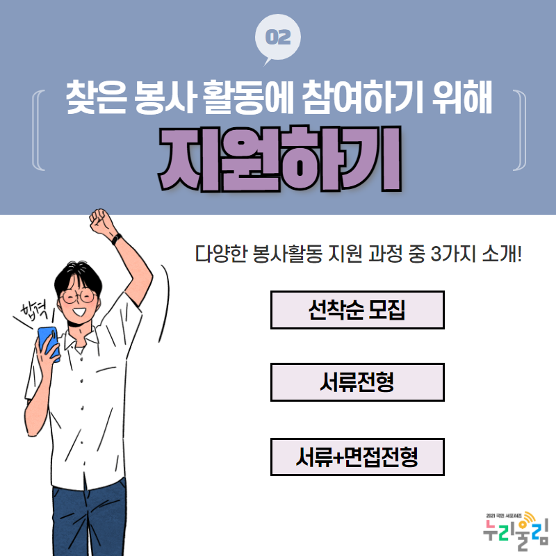 여기서 서류전형과 면접전형을 받아 본 제가 TIP을 간단히 드리자면, 서류에서는 봉사에 지원하게 된 목적, 참여하여 이루고자 하는 바를 해당 봉사의 성격과 연관 지어 쓰는 것이 좋습니다. 면접에서는 밝은 모습을 보여주고, 진심을 담아 이야기하면 좋겠죠? 그리고 봉사를 진행하며 발생 가능한 문제를 미리 떠올리고 해결 방안을 생각해보고 임하는 것도 좋은 방법입니다.