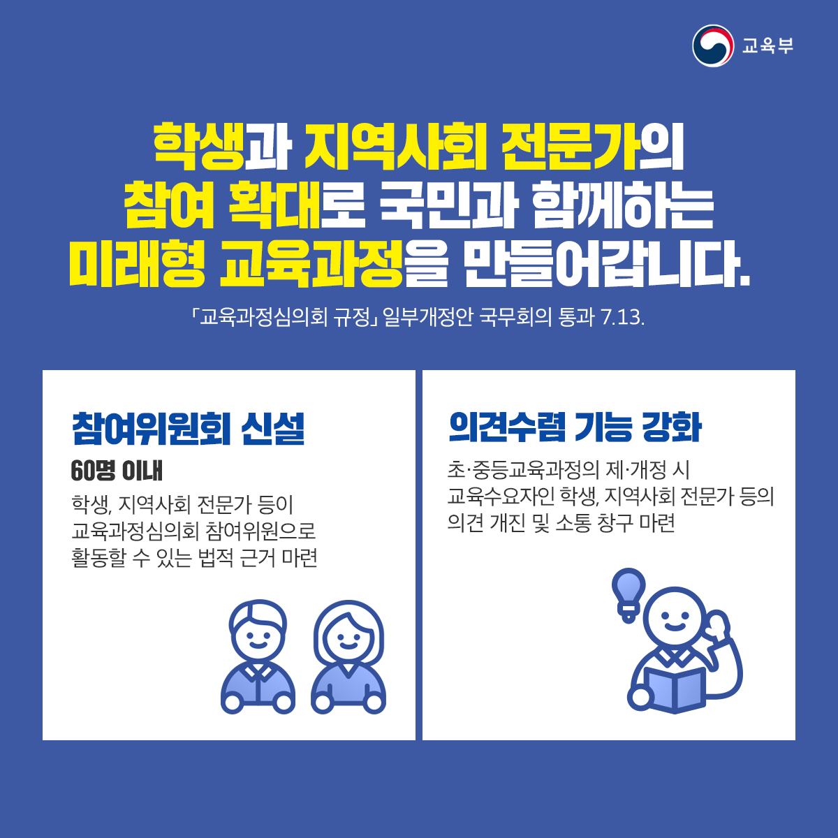 학생, 지역사회 전문가 등이 교육과정심의회 참여위원으로 활동할 수 있는 법적 근거 마련