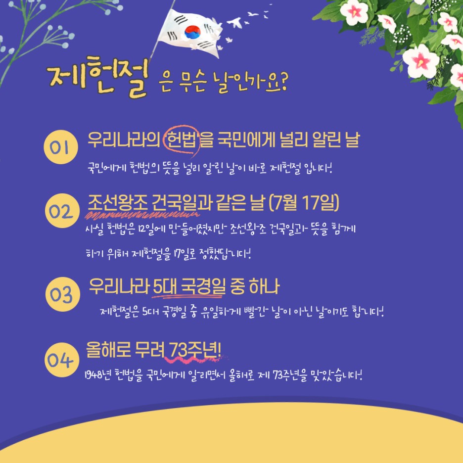 올해로 제73주년을 맞은 제헌절은 우리나라의 ‘헌법’을 만든 것을 기념하여 국민에게 널리 알린 날입니다! 사실 헌법은 7월 17일이 아닌 7월 12일에 만들어졌지만, 조선왕조 건국일인 7월 17과 뜻을 함께 하기 위해 7월 17일에 맞춰 헌법과 그 뜻을 널리 알렸다고 합니다.