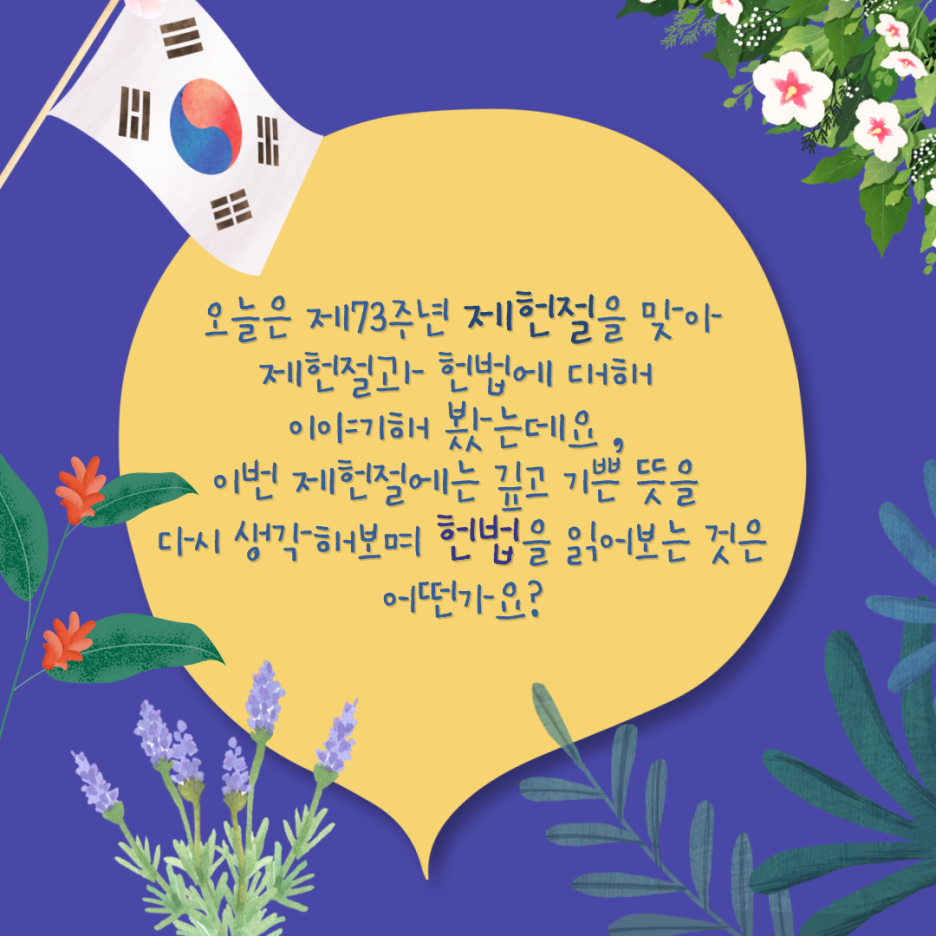 저는 이렇게 7월 17일에 담긴 숨겨진 의미를 알게 되면서 헌법이 당시 앞으로 나라가 주체적으로 나아가는 데에 있어서 얼마나 중요한 첫걸음이었을지 다시 한번 생각하게 됐던 것 같습니다. 쉽게 비유해서 마치 하는 행동도, 가는 곳도 한정적인 학생의 신분에서 벗어나 성인이 되어 주체적인 ‘나’로서 첫걸음을 내딛는 느낌과 비슷한 것 아닐까요?