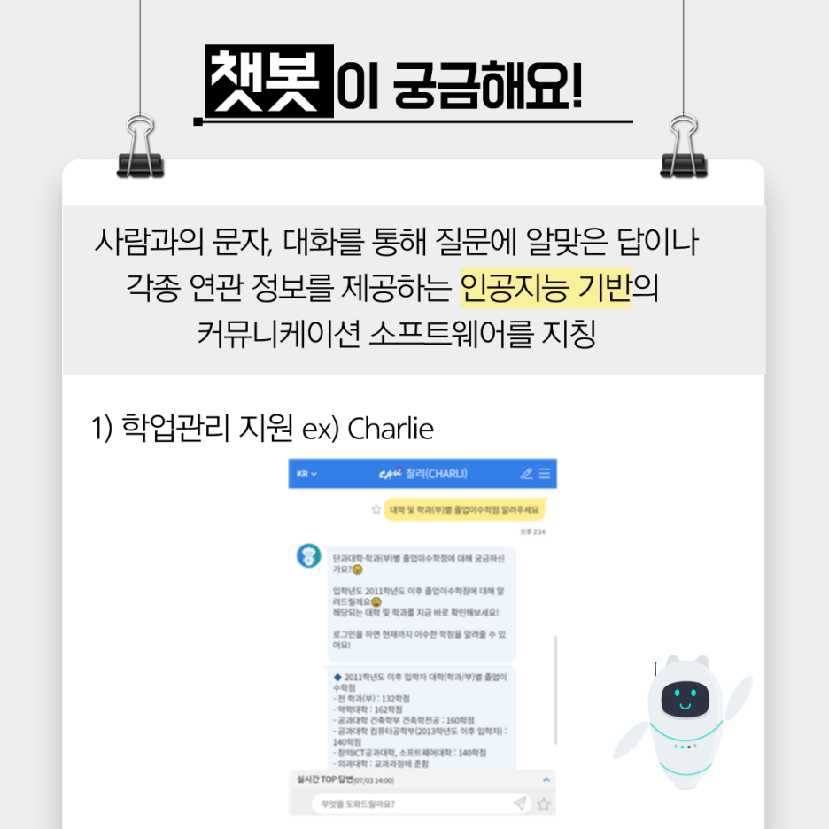 A. 첫 번째, 학업 관리를 지원해줄 수 있어요. 챗봇을 학습자의 전반적인 학업 관리를 지원하는 가상 튜터로 활용할 수 있다는 뜻인데요. 예를 들어 학생의 과제를 관리해주거나 교사 대신 설문조사를 실시해주고 학사관리 정보를 제공해줄 수 있어요. 실제로 중앙대학교에서는 “찰리(Charlie)”라는 챗봇을 활용하여 학생들의 궁금증을 해결해주고, 이수학점, 전자 출결현황, 강의시간표 조회 등 학생 맞춤형 정보도 제공한답니다.