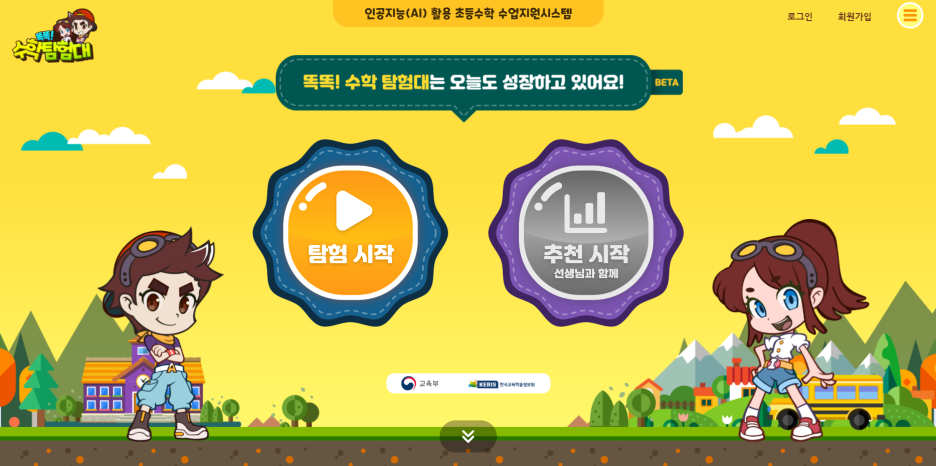 앞서 설명드린 사례 이외에도 실제로 교육부에서 AI와 교육을 연결한 사례가 있었는데요. 바로 인공지능(AI) 기술을 활용하여 초등학교 저학년 학교 수업 및 가정 학습을 지원하는 ‘똑똑! 수학탐험대(이하 수학탐험대)’입니다! 이 서비스는 2020년 9월에 시행하여 전국 모든 초등학교에 제공하였는데요. ‘수학탐험대’는 학생이 학습한 내용을 인공지능 기술을 통해 분석・예측하여 학생 수준에 맞는 학습 콘텐츠를 추천하고 학습 조언을 제공하는 시스템이기 때문에 학생들의 자기주도학습을 유도할 수 있답니다!