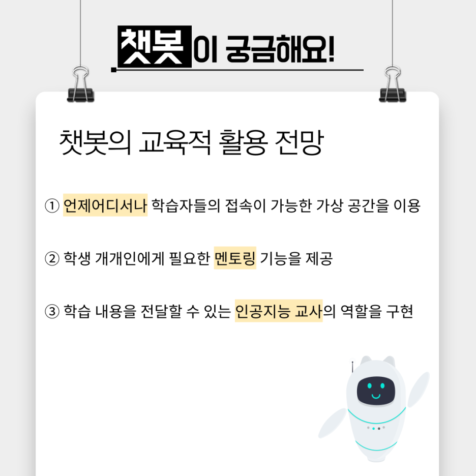 이 밖에도 온라인 수업을 지원해줄 수 있는데, 상담 챗봇, 검색 챗봇, 교과 Q&A 챗봇과 같이 다양하게 활용할 수 있답니다.