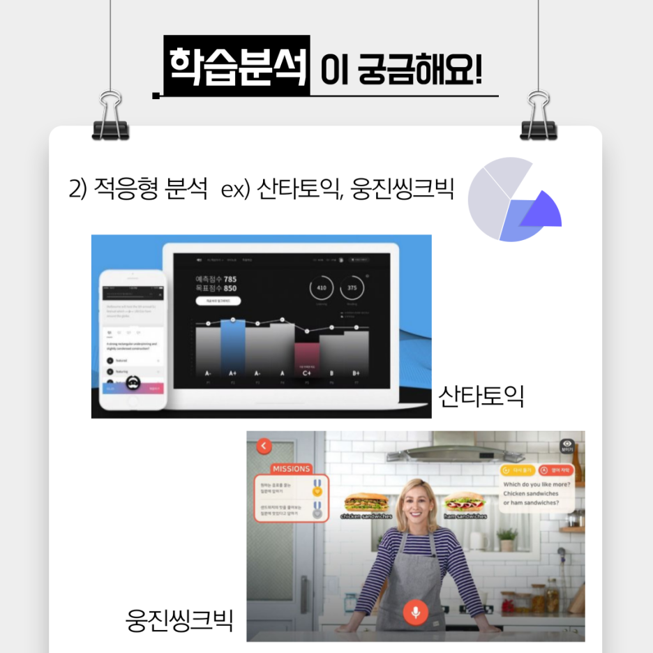 또한, 적응형 분석에 이용될 수 있어요. 적응형 분석이란, 학습자 진단 평가를 실시하여 학습자의 선수학습 상황, 현재 지식 상태를 분석하고 평가 결과에 따라 학습모드를 달리하여 콘텐츠 제공하는 방식이에요. 현재 산타토익과 웅진씽크빅에서도 활용하고 있어요. 산타토익에서는 AI가 간단한 테스트를 통해 학습자의 수준을 점검합니다. 웅진씽크빅의 AI 스피킹은 AI가 사전평가와 학습과정을 실시간으로 분석해 16가지 학습코스를 설계한답니다. 이를 통해 이용자 수준에 맞는 영어 말하기 학습이 가능해요!