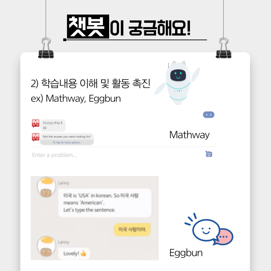 두 번째, 학습 내용 이해 및 활동을 촉진할 수 있어요. 예를 들어 ‘Mathway’라는 웹사이트에서는 수학 공식을 입력하면 어떠한 복잡한 공식이더라도 설명과 함께 답을 알려준답니다. ‘Eggbun’이라는 앱은 외국인들에게 한글을 알려주는 동시에 다양한 활동들을 통해 학습자들이 흥미를 가지고 학습할 수 있도록 도와주고 있어요!