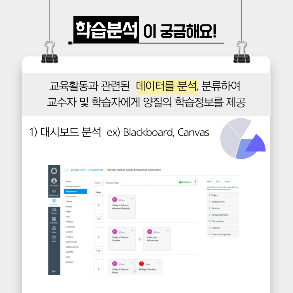 A. 교육활동과 관련된 복잡하고 많은 양의 데이터를 분석, 분류하여 교수자 및 학습자에게 양질의 학습정보를 제공하기 위해 등장한 개념이랍니다.