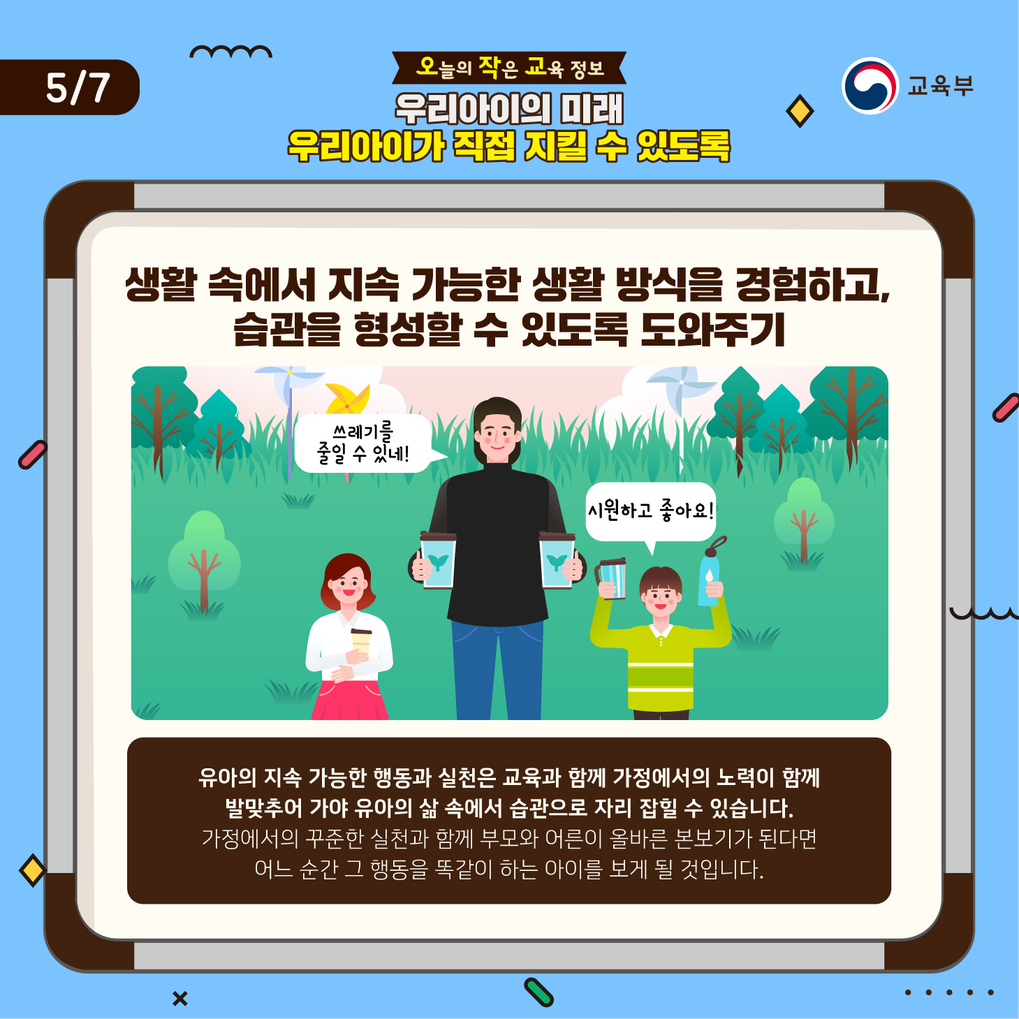 ✔ 유아의 지속 가능한 행동과 실천은 교육과 함께 가정에서의 노력이 함께 발맞추어 가야 유아의 삶 속에서 습관으로