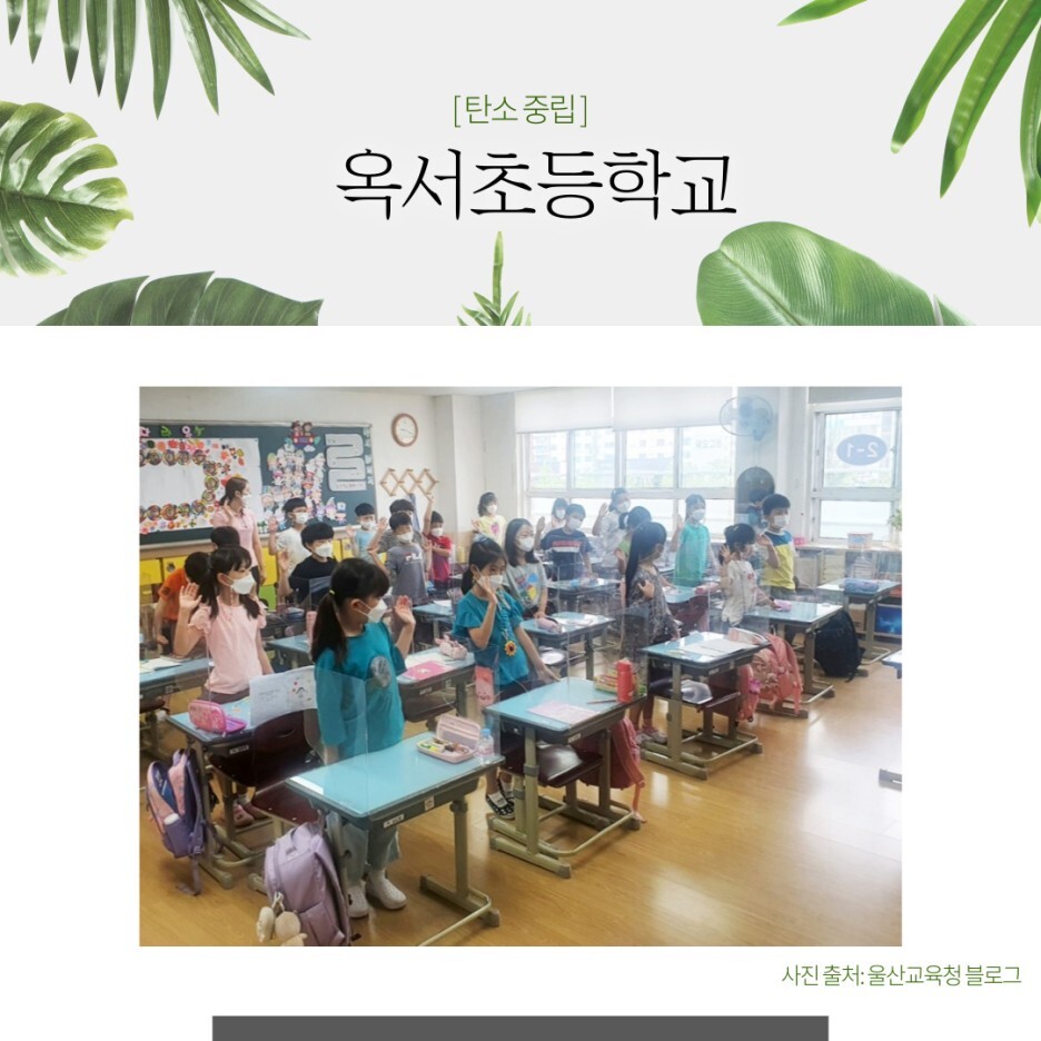 마지막으로 옥서초등학교가 있는데요, 옥서초등학교는 초등학교 중 유일하게 탄소 중립 중점학교로 선정이 되었습니다. 옥서초등학교에서는 전교생을 대상으로 하는 환경생태 프로젝트 수업을 시행하고, 지역 환경 교육센터와 협업하는 등 다양한 환경 교육 프로그램을 운영하고 있습니다. 지역 환경교육센터와 MOU를 체결하여 지역과 함께하는 탄소 zero를 시행하고, 탄소 중립 사회, 기후 위기 대응 등 교원 생태 시민 전문적 학습공동체를 구성하여 운영하고 있습니다.