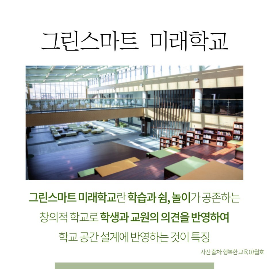 다음으로 그린스마트 미래학교에 대해 알아봅시다. 그린스마트 미래학교란 쉽게 말하면 학습과 쉼, 놀이가 공존하는 창의적 학교인데요. 그린스마트 미래학교는 한국판 뉴딜사업의 10대 과제 중 하나로, 기존 학교 시설과 달리 학생과 교원 등 학교의 사용자 의견을 반영하는 것이 특징입니다. 건축전문가, 교육과정 전문가가 학생과 교원 등의 의견을 모아 이를 실제로 학교 공간 기획과 설계에 반영하여 실제 사용자들이 진정한 주인공이 될 수 있도록 구현하고 있답니다.