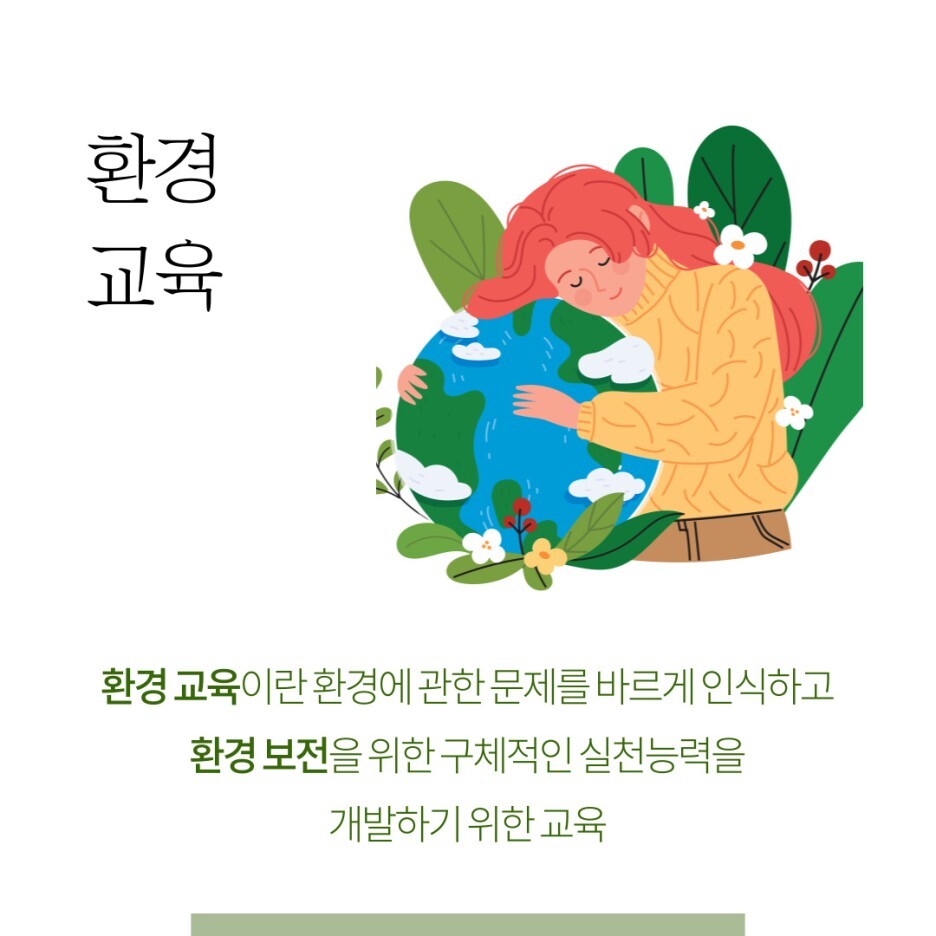 환경 교육이란 환경에 관한 문제를 바르게 인식하고 환경 보전을 위한 구체적인 실천 능력을 개발하기 위한 교육을 말합니다. 아마 여러분들도 환경 교육을 한 번씩은 받아보셨을 거라는 생각이 드는데요, ‘분리수거 제대로 하기’, ‘음식 남기지 않기’ 등 환경을 지킬 방법을 배우는 것도 환경 교육에 포함된다고 할 수 있죠!