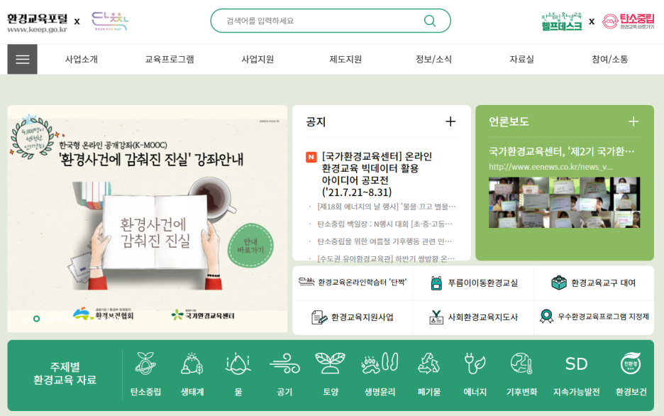 국가환경교육사업 운영 및 탄소중립을 비롯한 다양한 환경교육 콘텐츠, 교육프로그램, 사업·제도지원, 환경현안 정책·소식 제공 등
