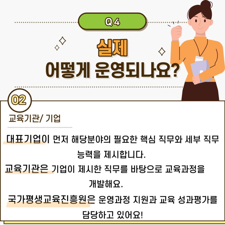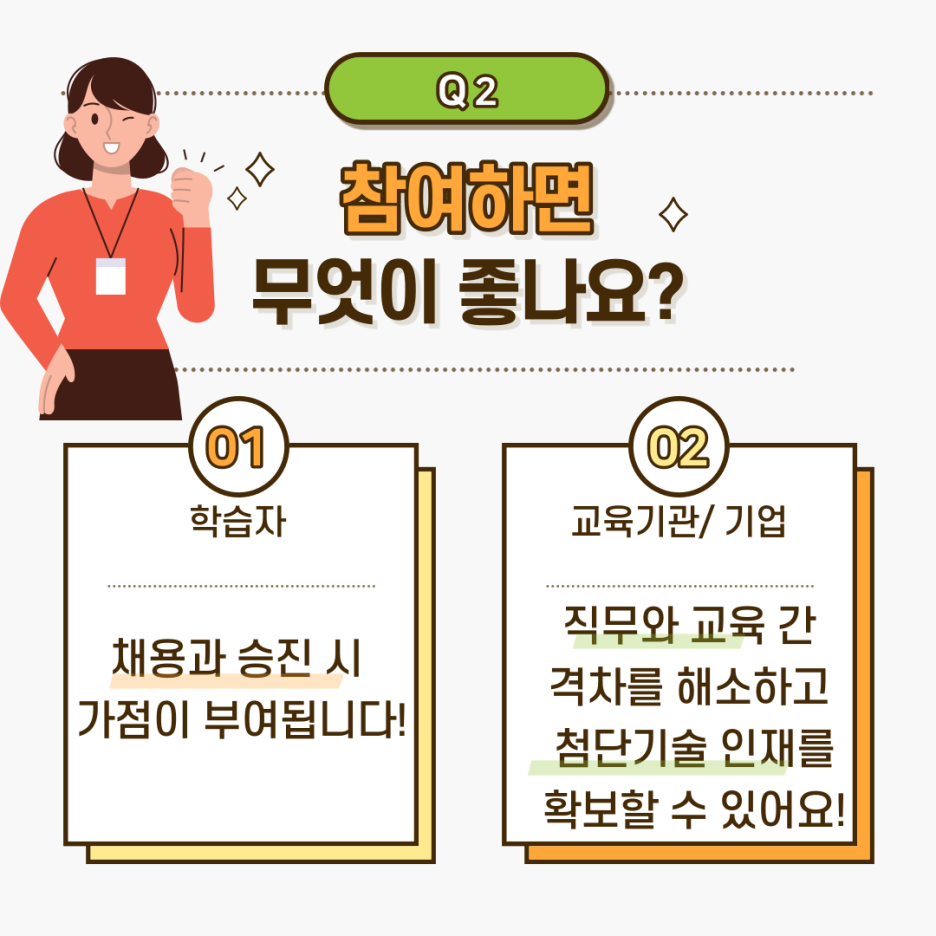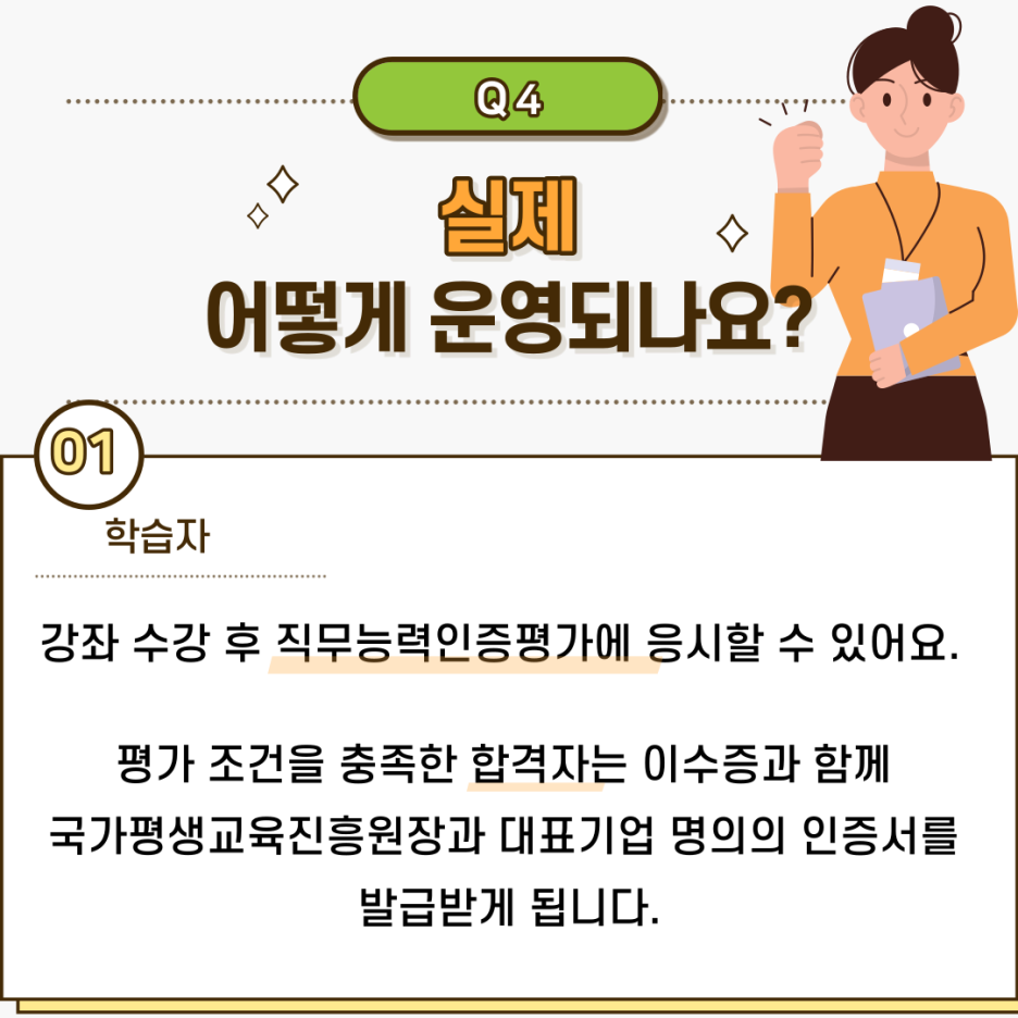 학습자는 자신이 원화는 강좌를 선택해 수강하면 됩니다. 교육과정이 끝나면 학습자는 기업이 개발한 직무능력인증평가에 응시할 수 있어요. 평가 조건을 충족한 합격자는 이수증과 함께 국가평생교육진흥원장과 대표기업 명의의 인증서를 발급받게 됩니다.